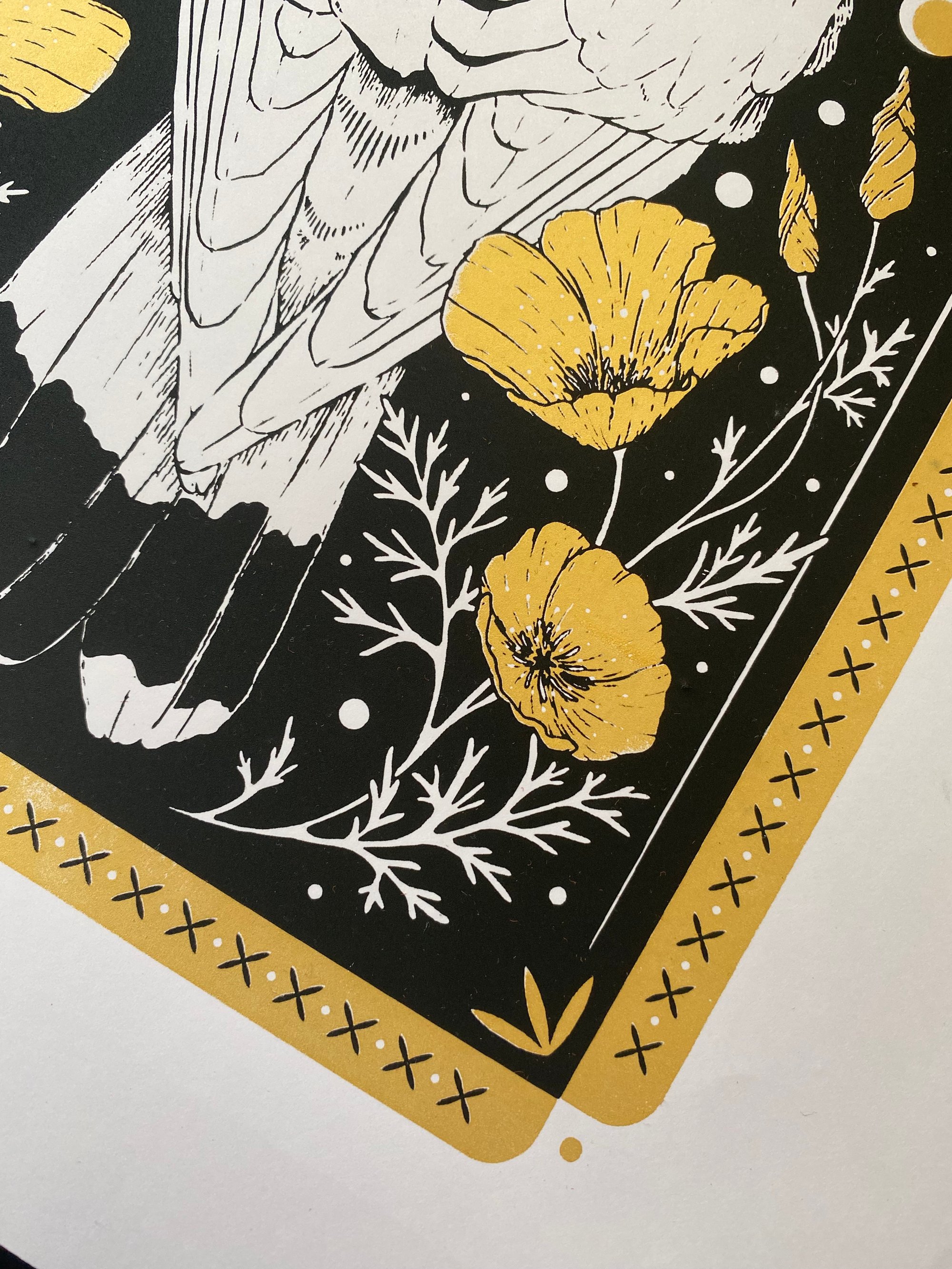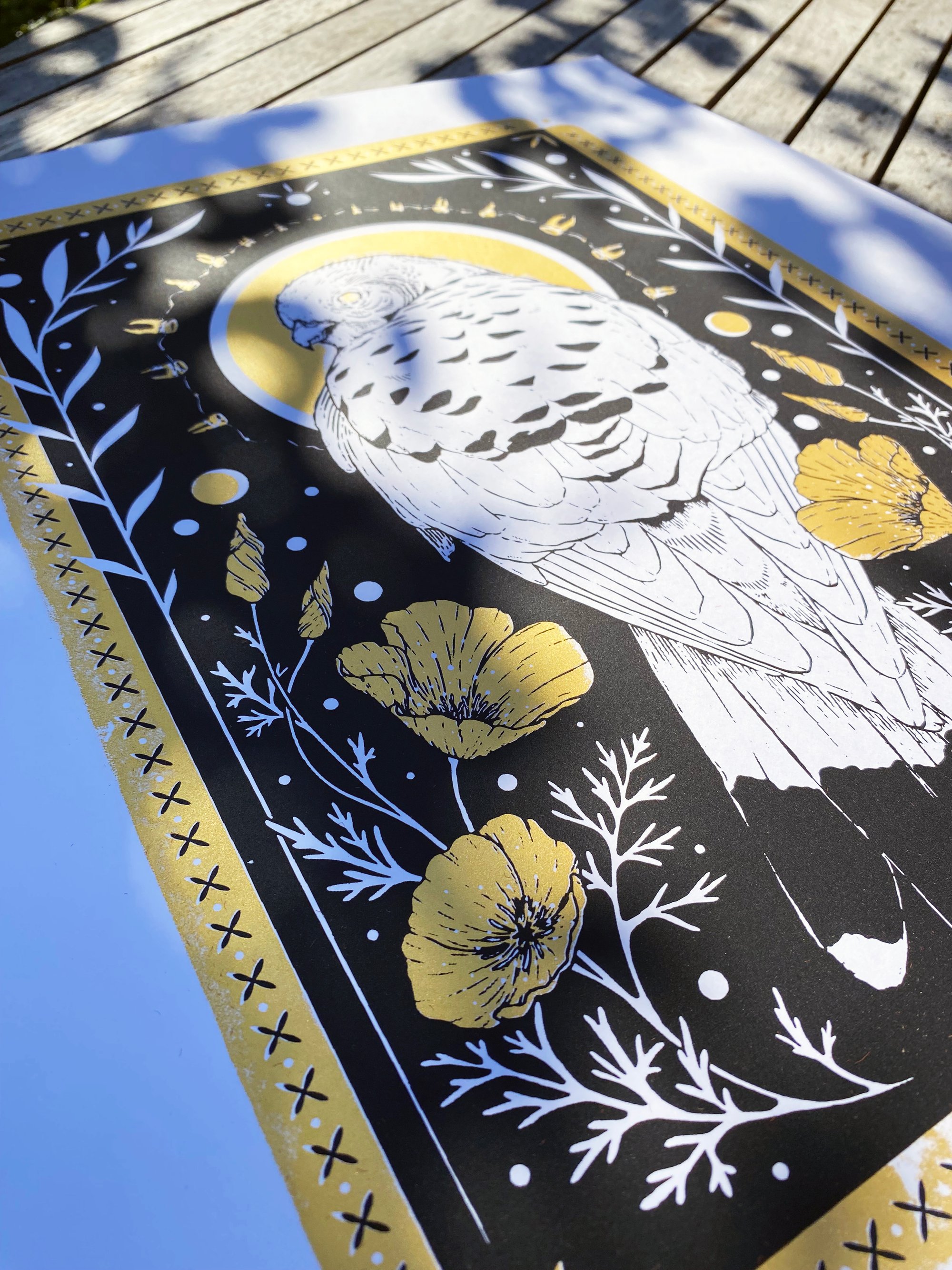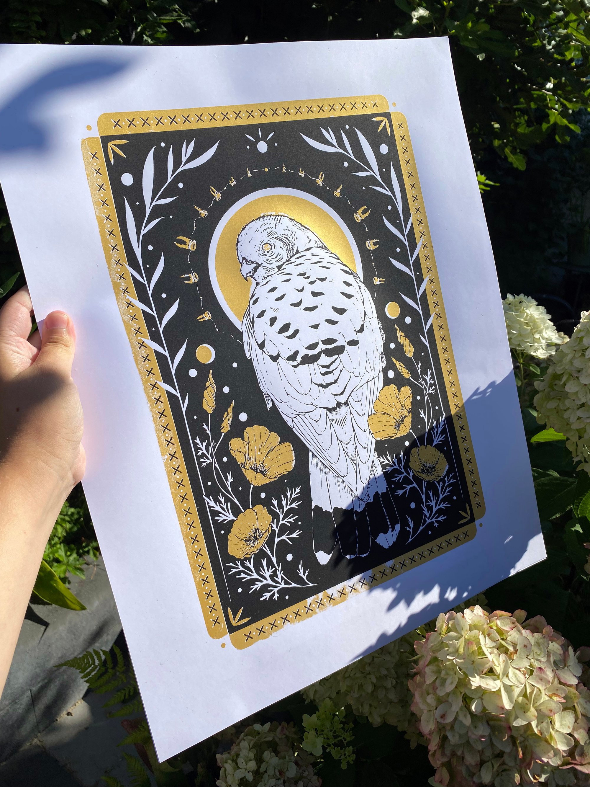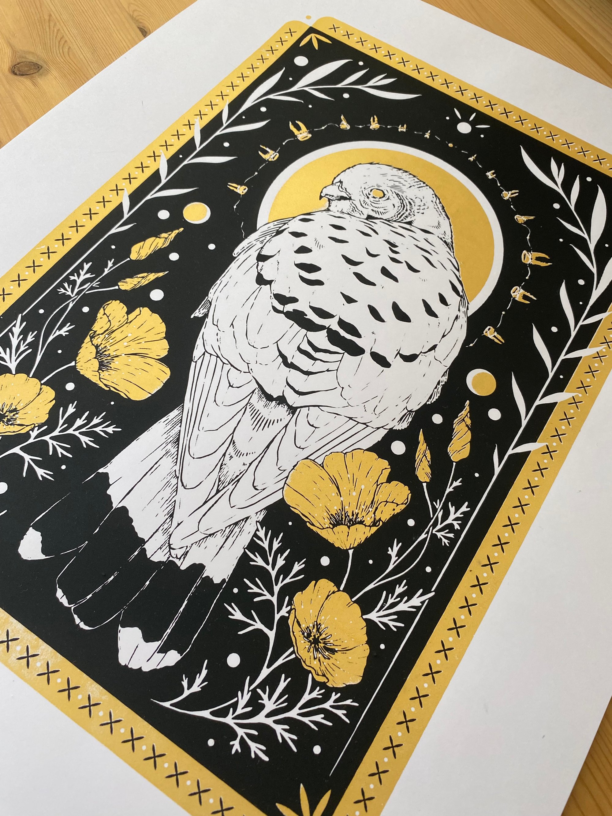 Please note: the print is handmade and not flawless (see pictures). This also makes each one unique. In some areas the gold ink is slightly rough, mainly along the bottom border and near the kestrel’s head.