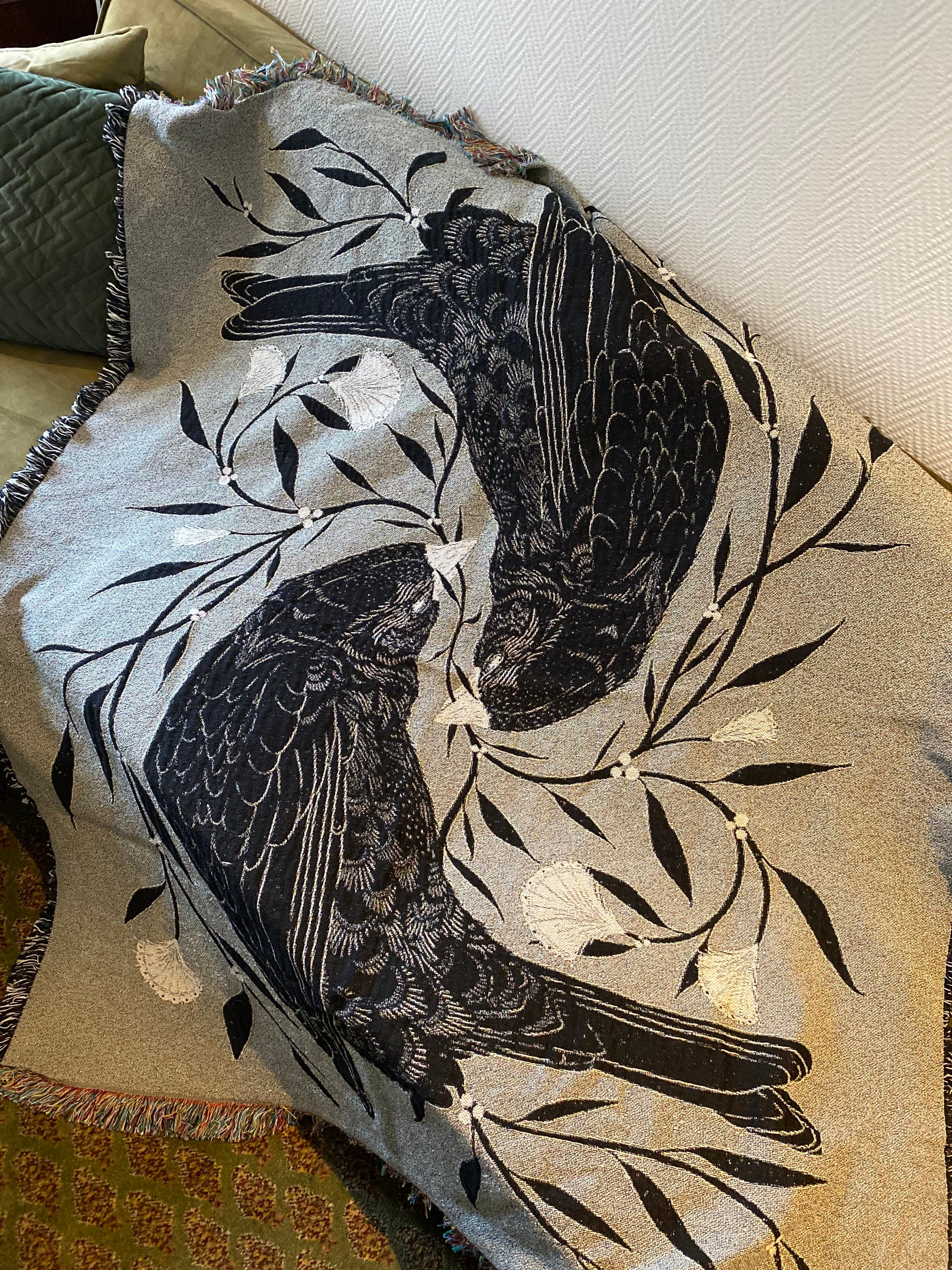 This tapestry/blanket is made in the USA using a woven technique that turns my 'Flow' illustration into a soft, detailed tapestry.